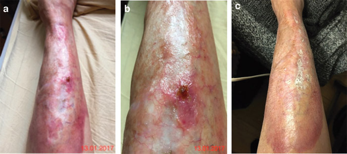 Мал. 1. Фаготерапія хронічного остеомієліту: (a) (b) уражена гомілка перед початком фаготерапії; (c) уражена гомілка після фаготерапії: стан шкіри вийшов, виразки загоїлися.