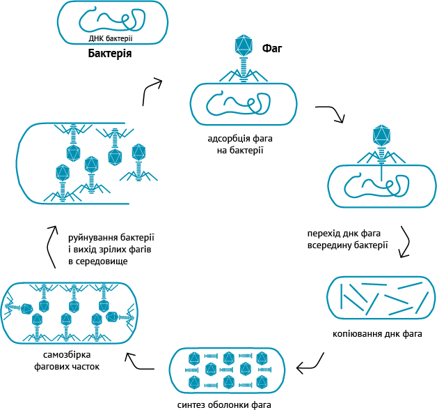 Літичний бактеріофаг, впізнавши «свою» бактерію, прикріплюється до її поверхні, розчиняє клітинну стінку і впорскує всередину генетичний матеріал. В результаті в бактерії припиняється синтез власних компонентів, ДНК бактерії руйнується та починається виробництво компонентів фага. З готових молекул ДНК та білків шляхом самозбирання в бактерії утворюються від 200 до 1000 зрілих фагових частинок (віріонів). Під дією фагового ферменту лізоциму та тиску зсередини, що наростає, клітинна стінка бактерії руйнується, та нові віріони виходять в навколишнє середовище. Весь цикл — від прикріплення фага до виходу його нащадків із бактерії — може тривати від декількох хвилин до декількох годин. Процес повторюється доти, поки не будуть зруйновані всі чутливі до даного фага бактерії.